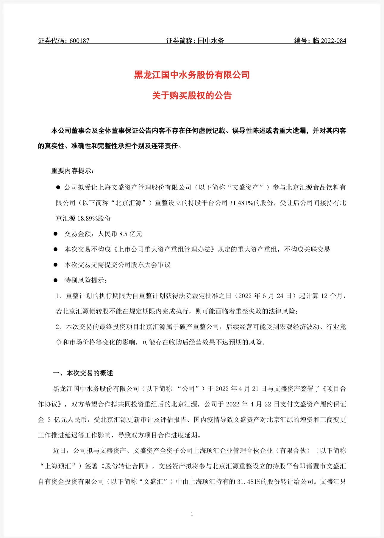 國(guó)中水務(wù)稱,公司于2022年4月21日與文盛資產(chǎn)簽署了《項(xiàng)目合作協(xié)議》,雙方希望合作擬共同投資重組后的北京匯源,公司于2022年4月22日支付文盛資產(chǎn)履約保證金3億元人民幣,受北京匯源更新審計(jì)及評(píng)估報(bào)告、國(guó)內(nèi)疫情導(dǎo)致文盛資產(chǎn)對(duì)北京匯源的增資和工商變更工作推進(jìn)延遲等工作影響,導(dǎo)致雙方項(xiàng)目合作進(jìn)度延期。