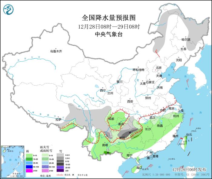 12月28日08時(shí)至29日08時(shí),內(nèi)蒙古東北部、黑龍江中東部和北部、西藏東部、川西高原大部、云南北部、貴州、湖南西部、重慶東南部、湖北西南部、江西北部、安徽南部、浙江西部等地部分地區(qū)有小雪或雨夾雪,其中,湖南西部、貴州中東部、云南東北部等地局地有中雪或大雪(5~7毫米)。江南大部、西南地區(qū)大部、廣西大部、廣東北部、海南島西部和東部、臺灣島東部等地部分地區(qū)有小雨,其中,云南東南部、臺灣島東部局地有中雨或大雨。內(nèi)蒙古中部等地部分地區(qū)有4~5級風(fēng)。東海南部、臺灣海峽及以東洋面、巴士海峽、南海中北部等地部分地區(qū)有6~7級風(fēng)(見圖1)。