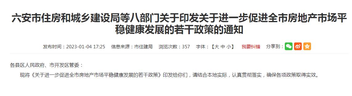 中新網(wǎng)1月5日電 據(jù)安徽省六安市住房和城鄉(xiāng)建設(shè)局網(wǎng)站消息,近日,六安市住房和城鄉(xiāng)建設(shè)局等八部門印發(fā)《關(guān)于進一步促進全市房地產(chǎn)市場平穩(wěn)健康發(fā)展的若干政策》。