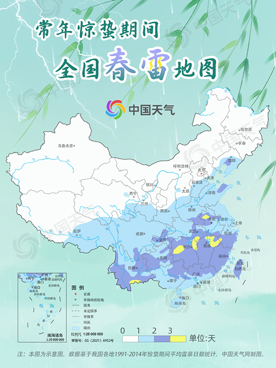 從中國天氣網(wǎng)推出的驚蟄節(jié)氣全國春雷地圖看,“驚蟄始雷”只與我國南方部分地區(qū)的氣候比較吻合。常年驚蟄期間,江南大部、云南大部、貴州南部、重慶中部、華南北部等地雷響頻繁,平均雷暴日數(shù)在2天以上,湖南、江西的部分地區(qū)可超過3天;最符合“驚蟄始雷”的是長江流域,合肥、福州、廣州、南京、杭州、上海等不少地方都在此時節(jié)迎來初雷。