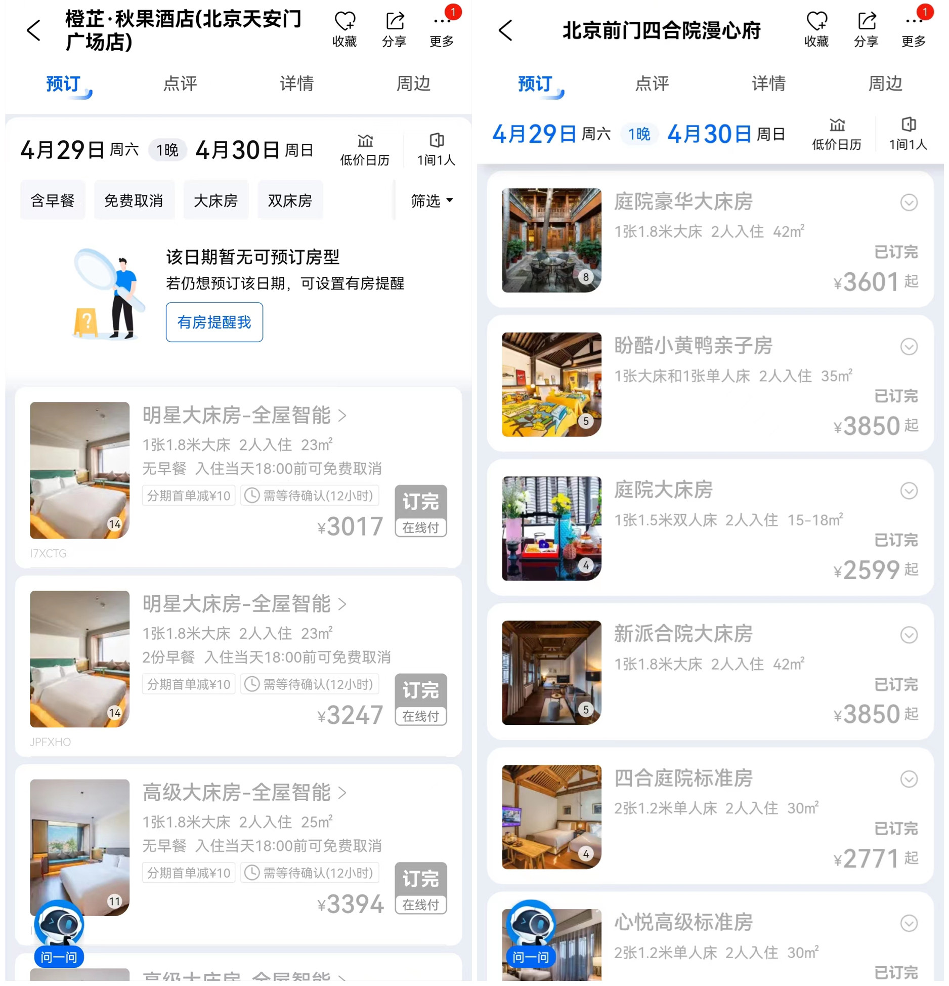 北京天安門(mén)附近有酒店已顯示滿(mǎn)房,或多個(gè)房型訂滿(mǎn)。截圖來(lái)源:攜程旅行App