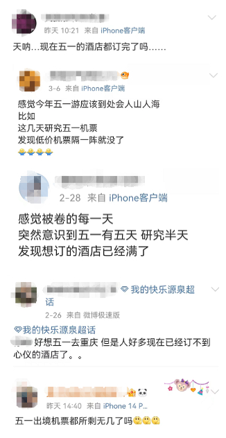 社交平臺(tái)上,多名網(wǎng)友早已規(guī)劃好了自己“五一”出行的計(jì)劃,并已提前購(gòu)買(mǎi)機(jī)票和酒店,面對(duì)緊俏的旅游產(chǎn)品,有網(wǎng)友驚呼:“現(xiàn)在就已經(jīng)訂不到房了嗎?”“低價(jià)機(jī)票隔一會(huì)兒就沒(méi)了!”