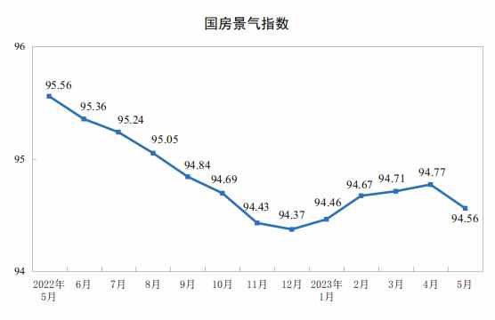 5月份,房地產(chǎn)開發(fā)景氣指數(shù)(簡稱“國房景氣指數(shù)”)為94.56。