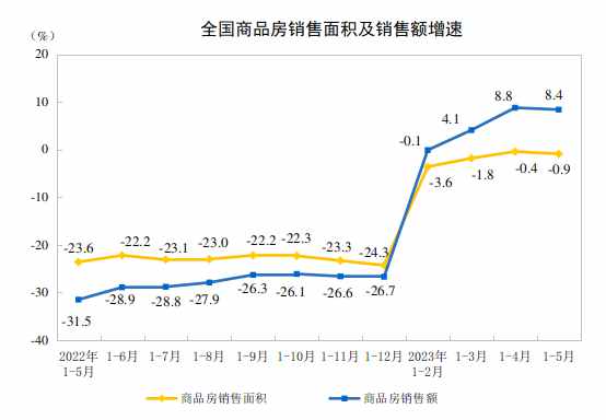 1—5月份,商品房銷售面積46440萬平方米,同比下降0.9%,其中住宅銷售面積增長2.3%。商品房銷售額49787億元,增長8.4%,其中住宅銷售額增長11.9%。