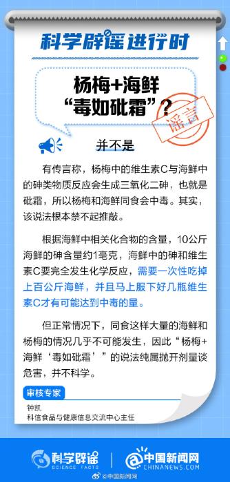 中新網(wǎng)7月14日電 有傳言稱,楊梅中的維生素C與海鮮中的砷類物質(zhì)反應(yīng)會(huì)生成三氧化二砷,也就是砒霜。這個(gè)說法科學(xué)嗎?戳圖片了解真相↓(來源:科學(xué)辟謠、中國(guó)新聞網(wǎng)微博)