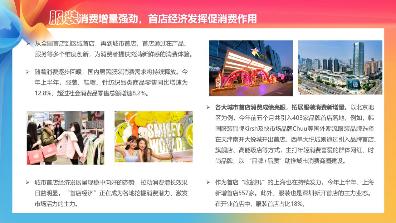 在服裝消費方面,隨著消費逐步回暖,國內居民服裝消費需求將持續(xù)釋放。以北京地區(qū)為例,今年前五個月共引入403家品牌首店落地。例如,韓國服裝品牌Kirsh及快市場品牌Chuu等國外潮流服裝品牌選擇在天津南開大悅城開出首店。西單大悅城則通過引入品牌首店、旗艦店、高能級店等方式,主打年輕消費喜愛的群體網(wǎng)紅、時尚品牌,以“品牌+品質”助推城市消費商圈建設。《報告》認為,“首店經(jīng)濟”正在成為各地挖掘消費潛力、激發(fā)市場活力的主力。