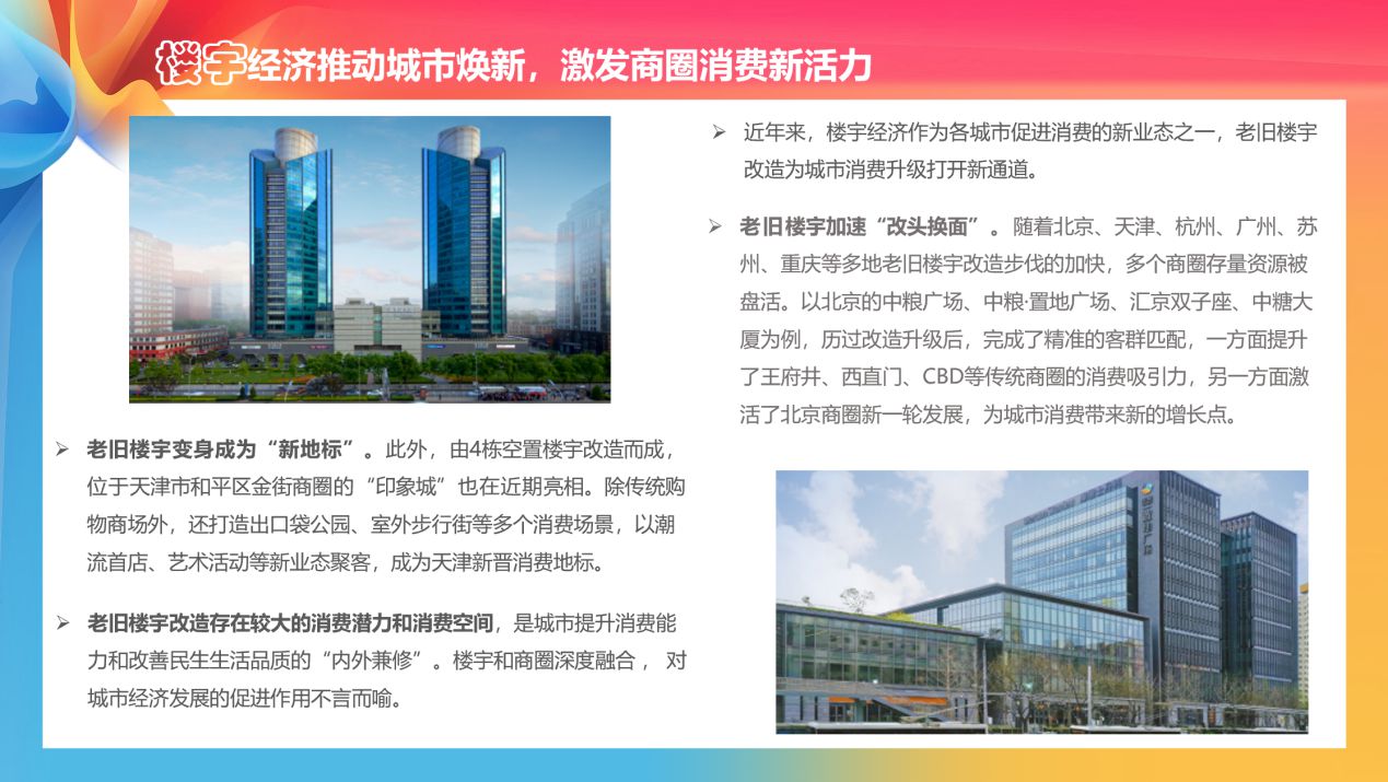 老舊樓宇改造存在較大的消費潛力和消費空間,是城市提升消費能力和改善民生生活品質的“內外兼修”?!秷蟾妗肥崂碇赋?,隨著北京、天津、杭州、廣州、蘇州、重慶等多地老舊樓宇改造步伐的加快,多個商圈存量資源被盤活。以北京的中糧廣場、中糧·置地廣場、匯京雙子座、中糖大廈為例,通過舊改提升、輕(中)資產(chǎn)輸出等方式,打造高端商務地標,完成了精準的客群匹配,一方面提升了王府井、西直門、CBD等傳統(tǒng)商圈的消費吸引力,另一方面激活了北京商圈新一輪發(fā)展,推動片區(qū)重構和能級提升,為城市消費帶來新的增長點。