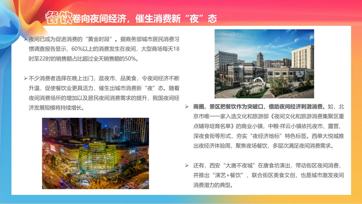 在餐飲消費方面,隨著夜間消費場所的增加以及居民夜間消費需求的提升,我國夜間經(jīng)濟發(fā)展規(guī)模將持續(xù)增長。例如,北京市唯一一家入選文化和旅游部《夜間文化和旅游消費集聚區(qū)重點輔導培育名單》的商業(yè)小鎮(zhèn),中糧·祥云小鎮(zhèn)依托夜市、露營、深夜食街等形式,構建了“商圈+生活圈+夜經(jīng)濟”的消費重地,榮獲北京十大商業(yè)品牌、消費季品牌榜“十大文化消費地標”。西安“大唐不夜城”在唐食坊演出,帶動街區(qū)夜間消費,并推出“演藝+餐飲”,聯(lián)合街區(qū)美食文創(chuàng),也是城市激發(fā)夜間消費潛力的典型?!秷蟾妗氛J為,隨著夜間消費場所的增加以及居民夜間消費需求的提升,我國夜間經(jīng)濟發(fā)展規(guī)模將持續(xù)增長。