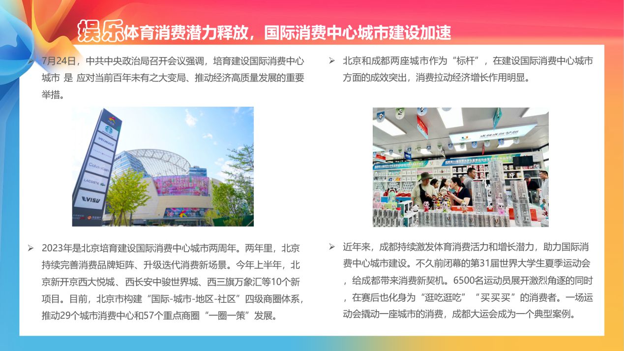 在娛樂體育消費方面,北京、成都兩座城市作為“標桿”,在建設國際消費中心城市方面的成效突出,消費拉動經(jīng)濟增長作用明顯。以北京為例,2023年是北京培育建設國際消費中心城市兩周年。兩年里,北京持續(xù)完善消費品牌矩陣、升級迭代消費新場景。今年上半年,北京新開京西大悅城、西長安中駿世界城、西三旗萬象匯等10個新項目。目前,北京市構建“國際-城市-地區(qū)-社區(qū)”四級商圈體系,推動29個城市消費中心和57個重點商圈“一圈一策”發(fā)展。