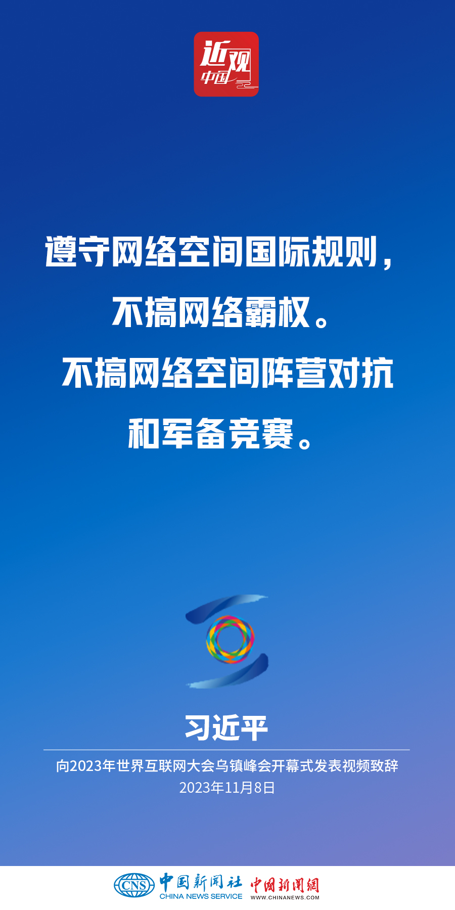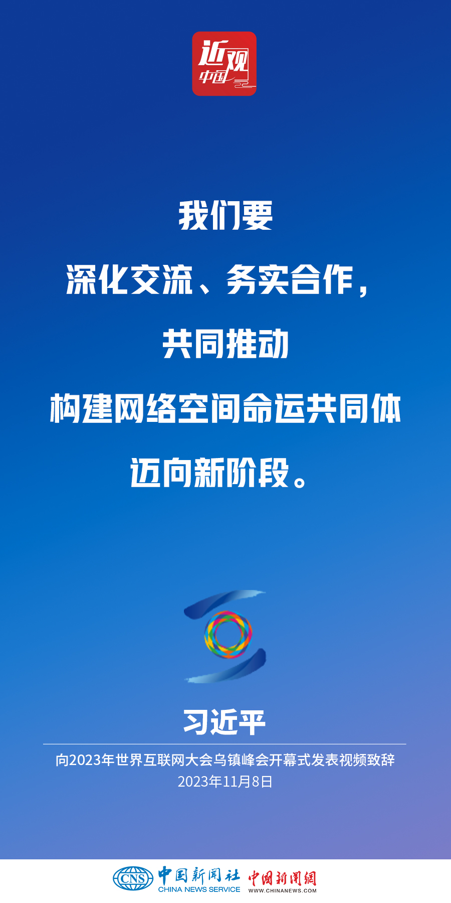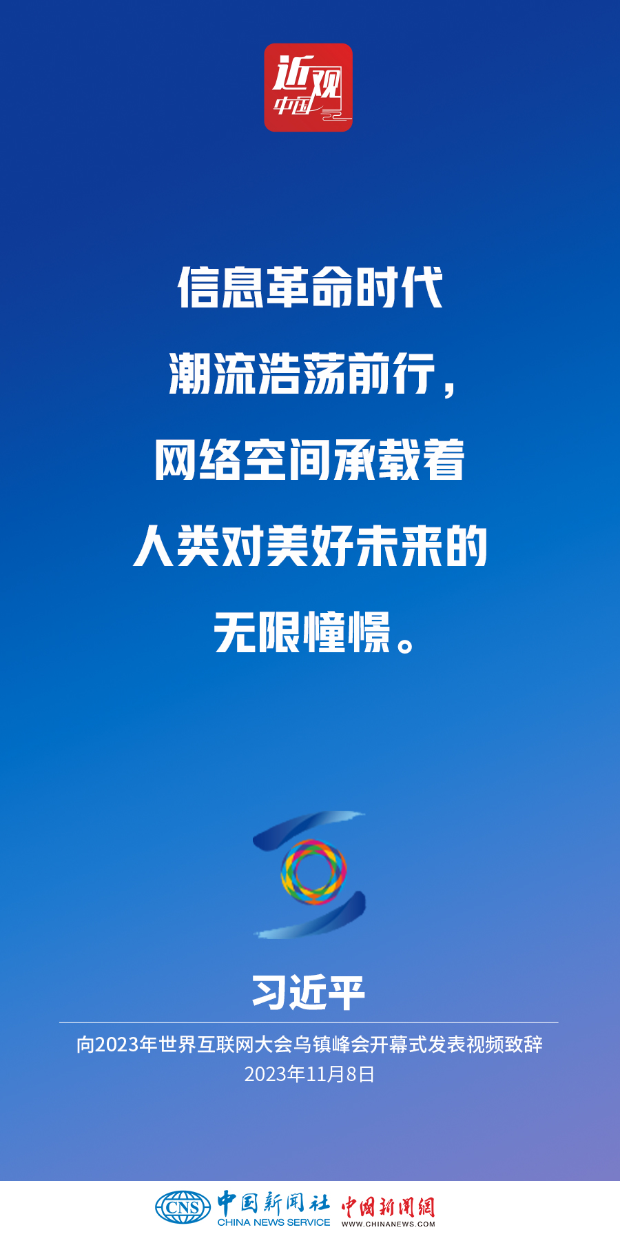 11月8日上午,國(guó)家主席習(xí)近平向2023年世界互聯(lián)網(wǎng)大會(huì)烏鎮(zhèn)峰會(huì)開(kāi)幕式發(fā)表視頻致辭。他指出——