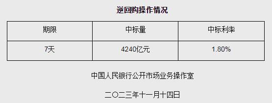 中新網(wǎng)11月14日電 據(jù)央行網(wǎng)站消息,為維護(hù)銀行體系流動(dòng)性合理充裕,2023年11月14日人民銀行以利率招標(biāo)方式開展了4240億元逆回購(gòu)操作,中標(biāo)利率1.80%,期限為7天。具體情況如下: