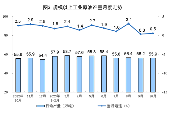 原油生產(chǎn)增速略有加快,進(jìn)口保持較快增長(zhǎng)。10月份,生產(chǎn)原油1733萬(wàn)噸,同比增長(zhǎng)0.5%,增速比9月份加快0.2個(gè)百分點(diǎn),日均產(chǎn)量55.9萬(wàn)噸。進(jìn)口原油4897萬(wàn)噸,同比增長(zhǎng)13.5%,增速比9月份放緩0.2個(gè)百分點(diǎn)。