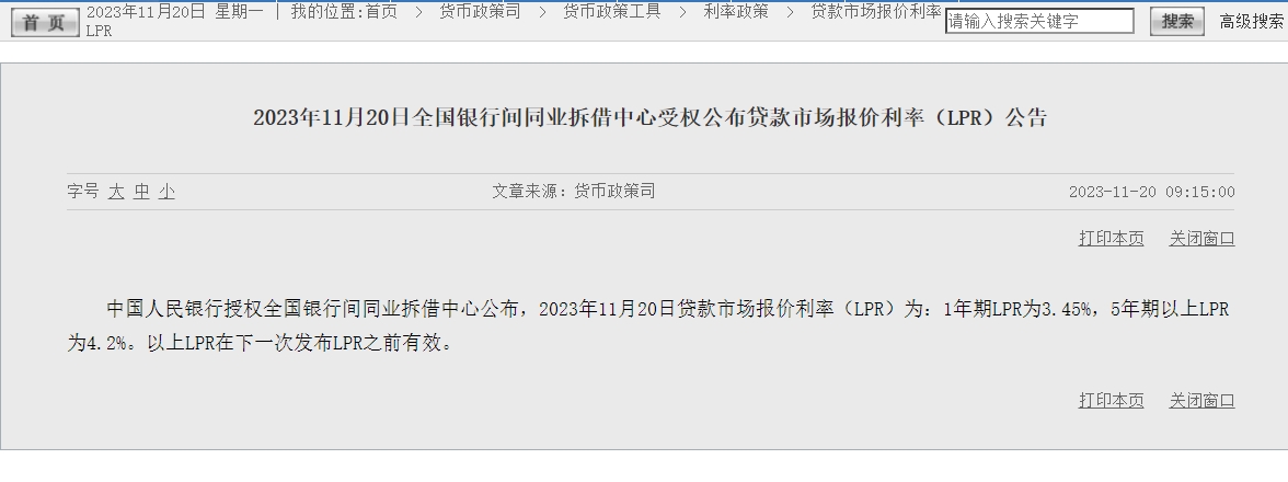 中新網(wǎng)11月20日電 據(jù)央行網(wǎng)站消息,中國人民銀行授權(quán)全國銀行間同業(yè)拆借中心公布,2023年11月20日貸款市場報(bào)價(jià)利率(LPR)為:1年期LPR為3.45%,5年期以上LPR為4.2%。以上LPR在下一次發(fā)布LPR之前有效。
