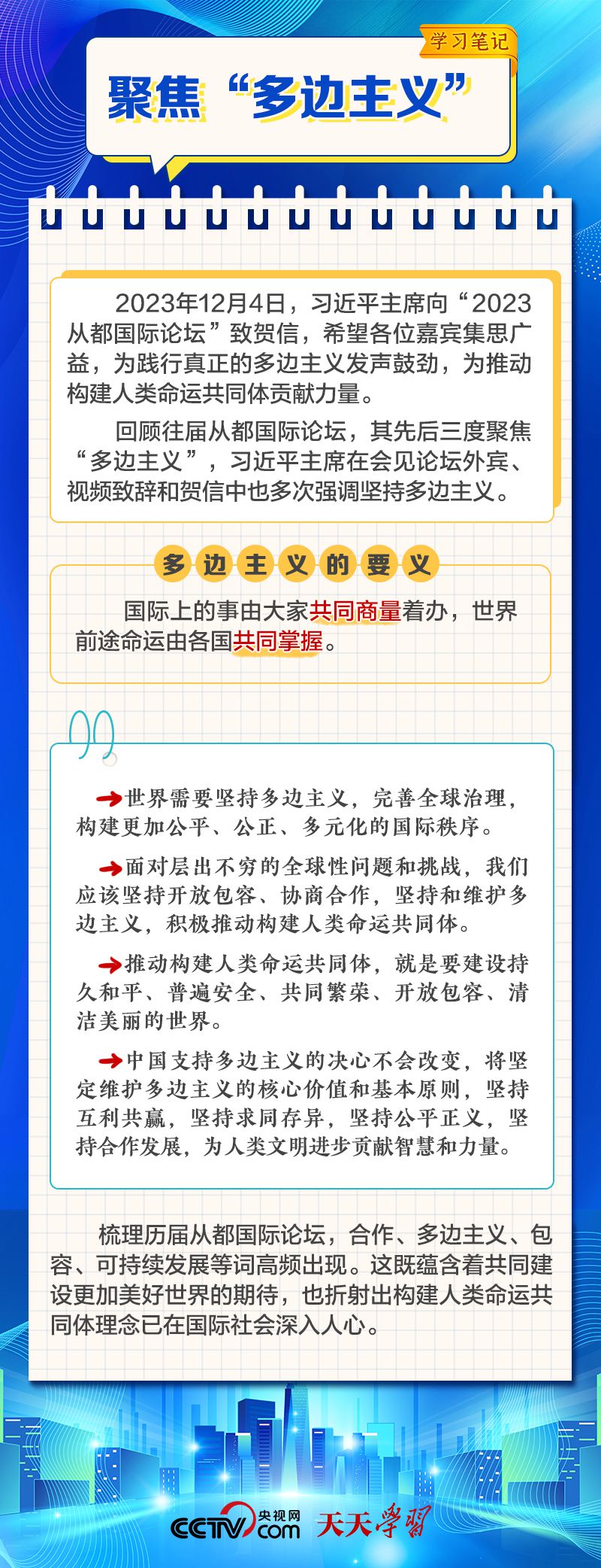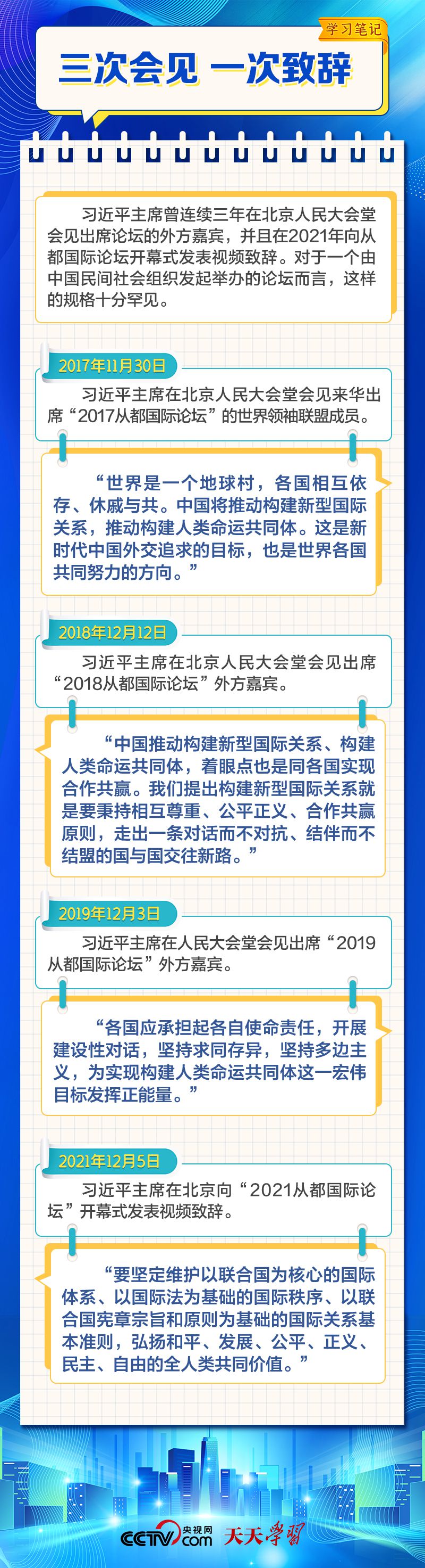天天學習 12月4日,習近平主席在致“2023從都國際論壇”的賀信中強調(diào),面對前所未有的世界之變、時代之變和歷史之變,人類社會必須團結(jié)起來,堅持互學互鑒、開放包容、合作共贏,弘揚全人類共同價值,共同建設(shè)更加美好的世界。