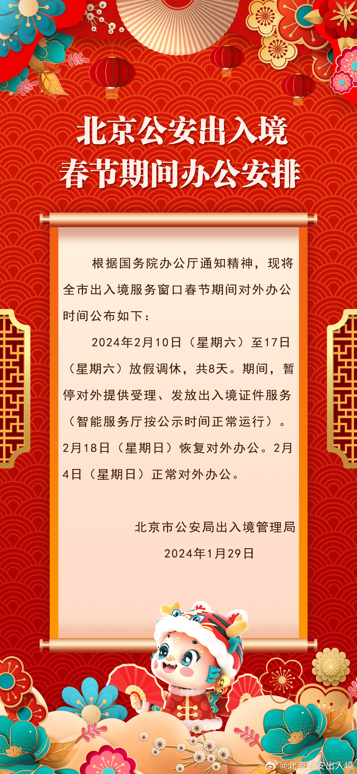 中新網(wǎng)1月29日電 據(jù)北京市公安局出入境管理局官方微博消息,北京市公安局出入境管理局發(fā)布春節(jié)期間辦公安排:北京市出入境服務(wù)窗口2月10日至17日(大年初一至初八)放假調(diào)休,共8天。期間,暫停對外提供受理、發(fā)放出入境證件服務(wù)(智能服務(wù)廳按公示時間正常運行)。2月18日(星期日)恢復對外辦公。2月4日(星期日)正常對外辦公。