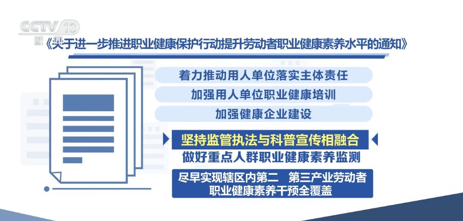 央視網(wǎng)消息:國家衛(wèi)生健康委、國家疾控局、教育部等八部門近日聯(lián)合印發(fā)《關于進一步推進職業(yè)健康保護行動提升勞動者職業(yè)健康素養(yǎng)水平的通知》?!锻ㄖ访鞔_,進一步加強職業(yè)健康管理,加大重點人群職業(yè)健康素養(yǎng)干預力度,到2030年,力爭實現(xiàn)重點行業(yè)勞動者對本崗位主要危害及防護知識知曉率不低于90%。