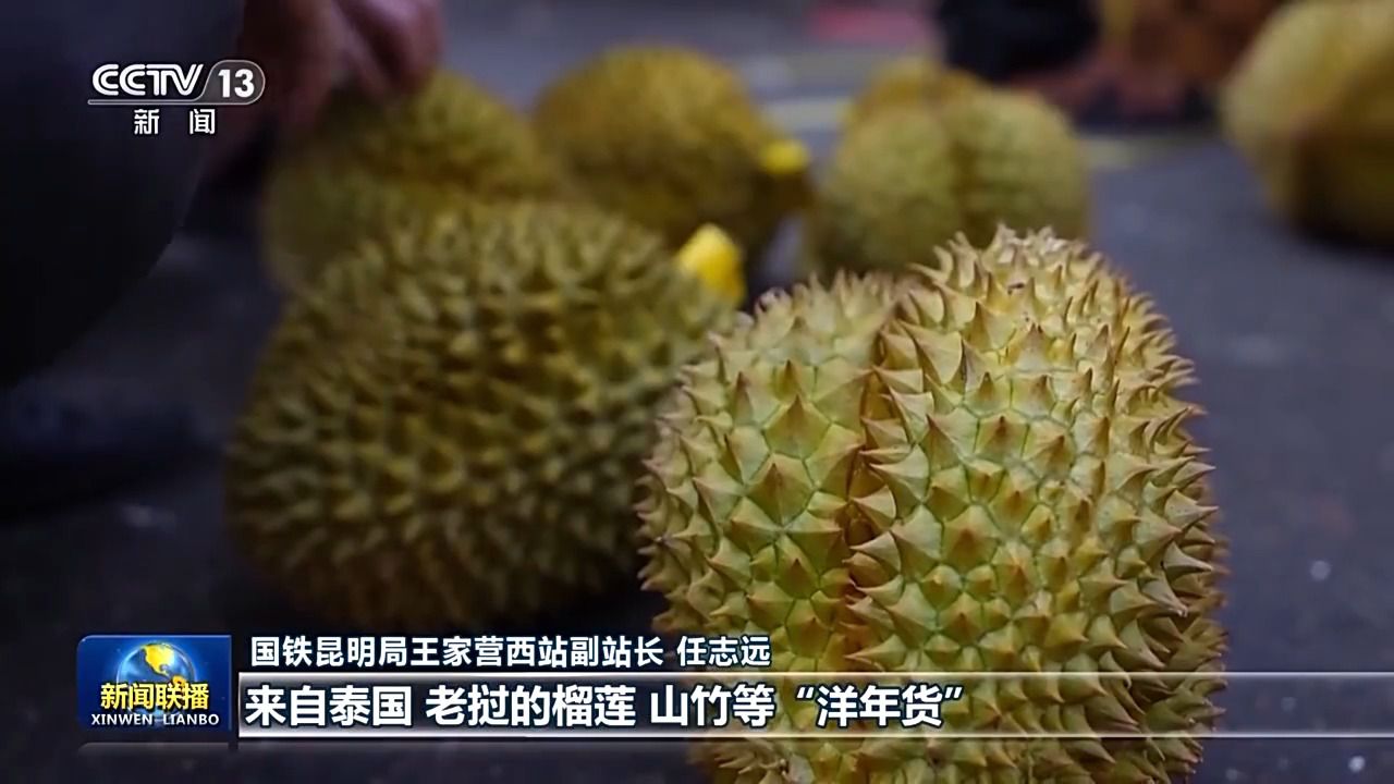 國(guó)鐵昆明局王家營(yíng)西站副站長(zhǎng) 任志遠(yuǎn):今年以來,車站進(jìn)出口貨物明顯增加,來自泰國(guó)、老撾的榴蓮、山竹等“洋年貨”源源不斷運(yùn)抵。國(guó)內(nèi)的“國(guó)貨潮牌”陸續(xù)運(yùn)往東南亞國(guó)家。