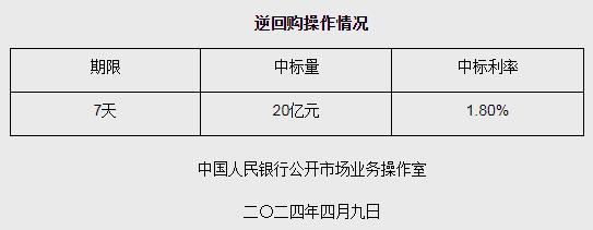中新網(wǎng)4月9日電 據(jù)中國人民銀行網(wǎng)站消息,為維護(hù)銀行體系流動(dòng)性合理充裕,2024年4月9日人民銀行以利率招標(biāo)方式開展了20億元逆回購操作。具體情況如下: