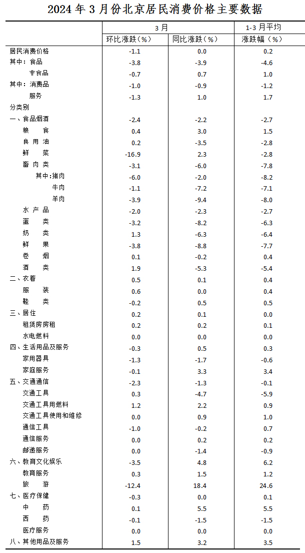 3月份,北京居民消費(fèi)價(jià)格同比持平。其中,食品價(jià)格下降3.9%,非食品價(jià)格上漲0.7%;消費(fèi)品價(jià)格下降0.9%,服務(wù)價(jià)格上漲1.0%。
