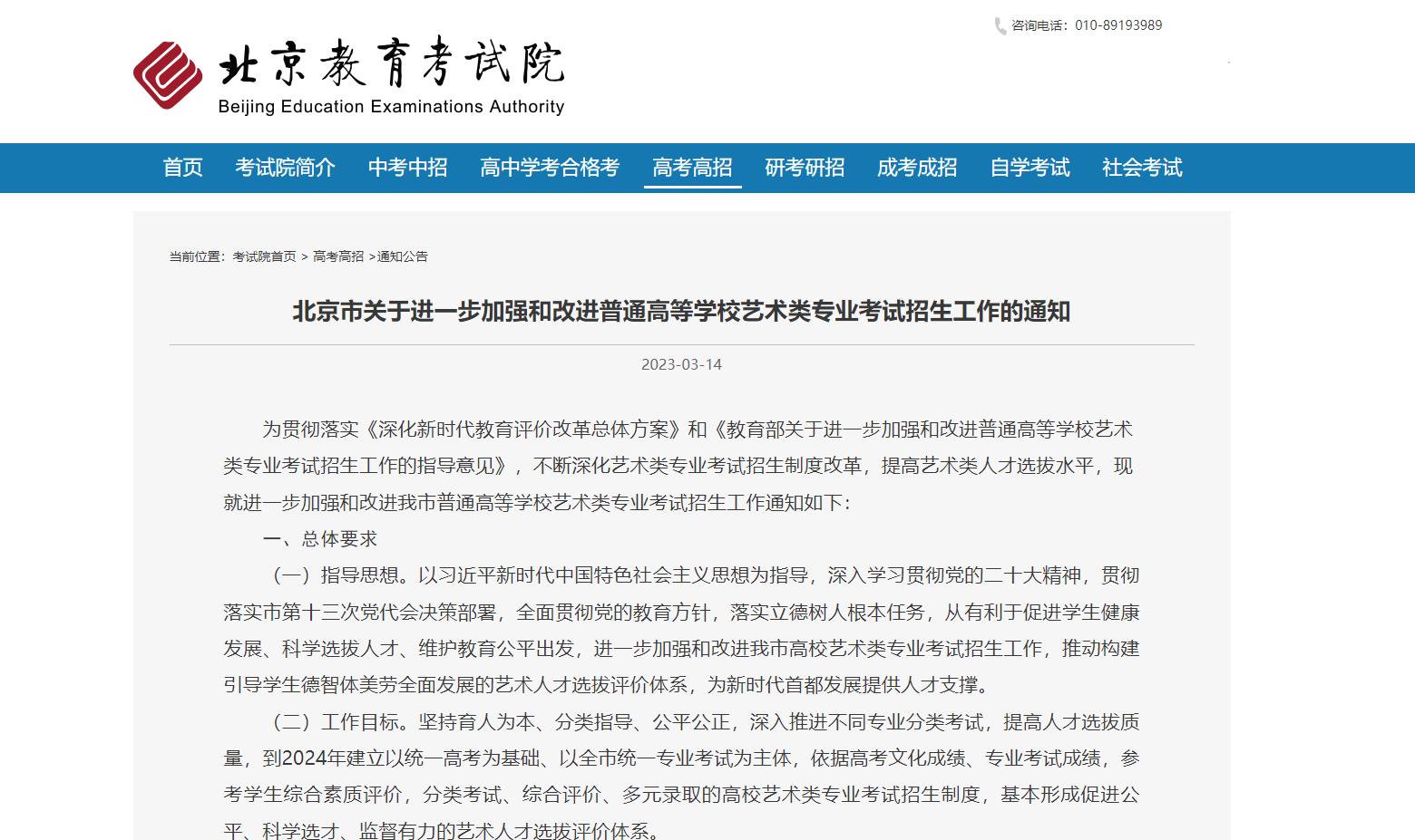 二是部分藝術(shù)類專業(yè)將取消專業(yè)能力考試。據(jù)北京教育考試院上述《通知》,2024年起,藝術(shù)史論、戲劇影視文學(xué)等高校藝術(shù)類專業(yè),直接依據(jù)考生高考文化課成績、參考考生綜合素質(zhì)評價,擇優(yōu)錄取。