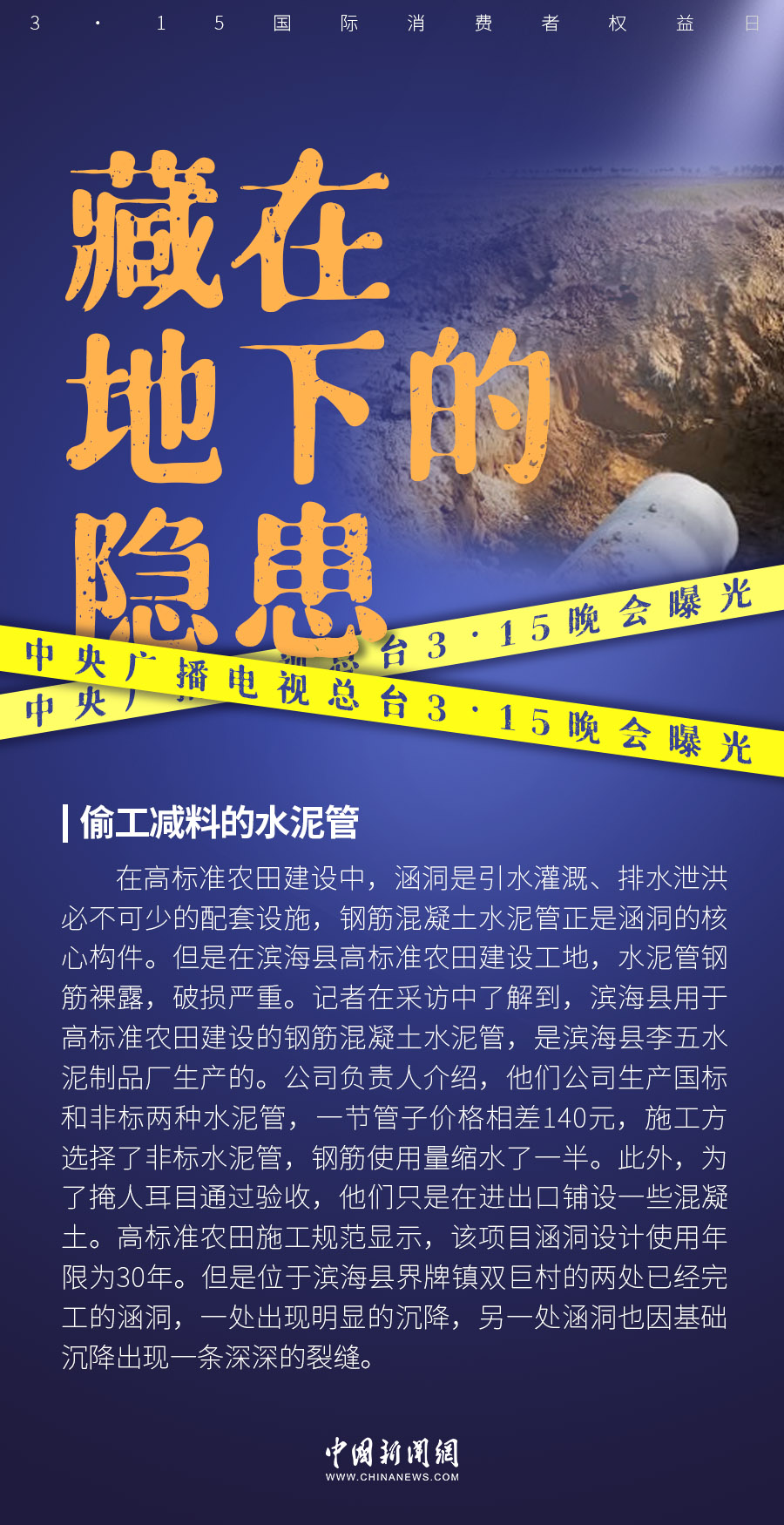 晚會曝光江蘇省鹽城市濱海縣高標(biāo)準(zhǔn)農(nóng)田的地下漏洞,用于建設(shè)的鋼筋混凝土水泥管存在偷工減料問題。施工方選擇了非標(biāo)水泥管,鋼筋使用量縮水了一半。中新財(cái)經(jīng)記者從鹽城市場監(jiān)管局獲悉,工作人員已經(jīng)行動,后續(xù)信息會及時(shí)對外公布。