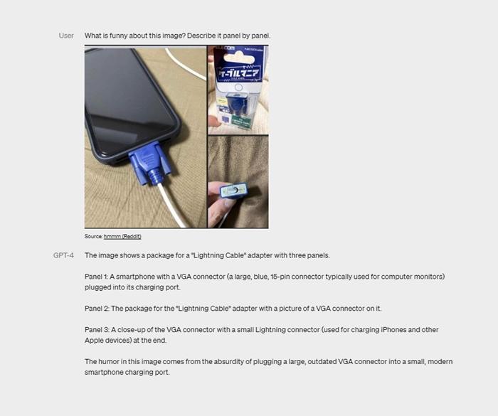 不過據(jù)OpenAI介紹,在輸入一張畫有VGA線連接手機(jī)充電接口內(nèi)容的圖像后,GPT-4除了能描述出這幅圖中的內(nèi)容,還能指出這張圖有哪些不對(duì)勁,“這幅圖中的幽默來自于將一個(gè)大的過時(shí)的VGA連接器插入一個(gè)小的現(xiàn)代化的智能手機(jī)充電端口。”