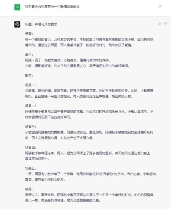 目前GPT-4僅限于ChatGPT Plus訂戶使用。記者體驗(yàn)時(shí)發(fā)現(xiàn),GPT-4生成速度比較慢,但回答簡明扼要,更有創(chuàng)造性,無論是寫詩歌還是故事劇本都不在話下。例如它可以根據(jù)“春天萬物復(fù)蘇”賦詩一首或者寫成一個(gè)愛情故事的劇本。