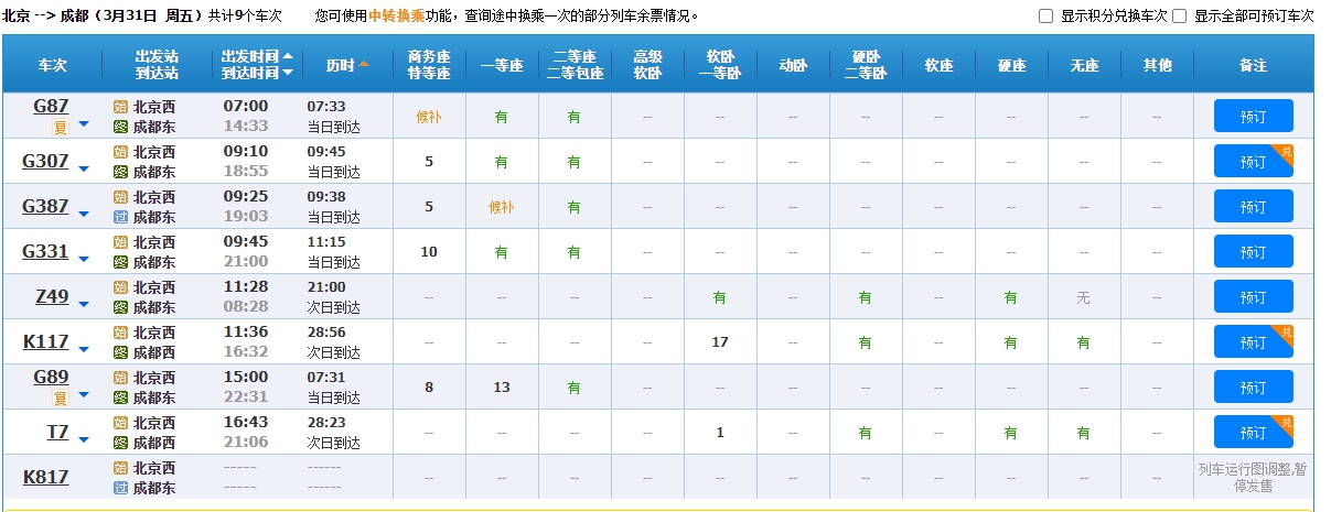 以北京開往上海、杭州、成都等方向的列車為例,3月31日、4月1日車次多數(shù)余票充足,僅個別車次需要候補購票。