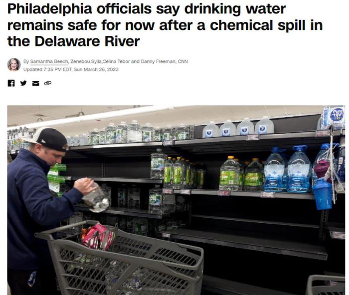 中新網(wǎng)3月27日電 綜合外媒報道,近日,美國賓州布里斯托爾一家工廠發(fā)生泄漏事故,大量化學(xué)物質(zhì)流入特拉華河一條支流中。事故發(fā)生后,費(fèi)城官員建議當(dāng)?shù)孛癖娛褂闷垦b水,引發(fā)恐慌性購買。