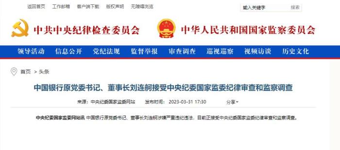 據(jù)中央紀(jì)委國(guó)家監(jiān)委網(wǎng)站3月31日消息,中國(guó)銀行原黨委書記、董事長(zhǎng)劉連舸涉嫌嚴(yán)重違紀(jì)違法,目前正接受中央紀(jì)委國(guó)家監(jiān)委紀(jì)律審查和監(jiān)察調(diào)查。