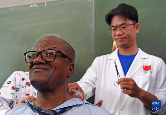 4月3日,在納米比亞溫得和克的伊曼紐爾·謝菲迪中學(xué)課堂上,校長卡奇翁瓜體驗(yàn)拔火罐。新華社發(fā)(穆薩·卡薩克攝)