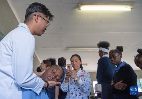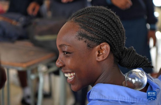 4月3日,在納米比亞溫得和克的伊曼紐爾·謝菲迪中學(xué)課堂上,一名學(xué)生體驗(yàn)針灸。新華社發(fā)(穆薩·卡薩克攝)