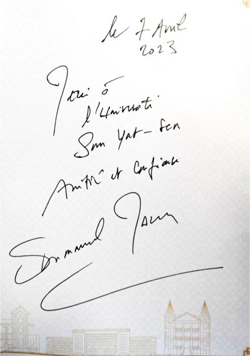 臨別之時(shí),馬克龍留下感言,為中山大學(xué)題字:“感謝中山大學(xué)的友誼與信任。埃馬紐埃爾·馬克龍,2023年4月7日。”