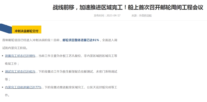 “背景完工狀態(tài)已達(dá)99%,當(dāng)前工作主要為外板工藝孔復(fù)位、非內(nèi)裝區(qū)域的區(qū)域完工等收尾工作;調(diào)試完工狀態(tài)已達(dá)61%,下階段重點工作為救生艇架配合掛艇測試、水密門系統(tǒng)調(diào)試等;內(nèi)裝完工目前進(jìn)展已達(dá)77%,下階段重點推進(jìn)艙室區(qū)域完工、公區(qū)天花封板完成等工作?!蓖飧邩蛟齑谂读耸姿覈a(chǎn)大郵輪最新完成情況。