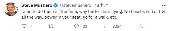 曾在中國工作多年的企業(yè)家Steve Mushero也留言說,“我以前一直坐高鐵,比坐飛機好多了。不麻煩,一直有wifi或5G,你的座位上有電源,還可以散散步等?!?/p>