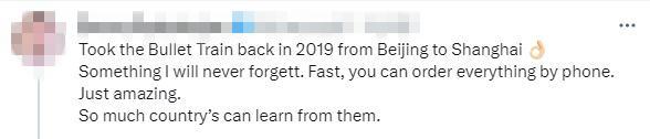 還有網(wǎng)友說,“2019年坐高鐵從北京到上海。一些事我永遠不會忘記。速度很快。太棒了。很多國家可以向他們學(xué)習(xí)?!?/p>