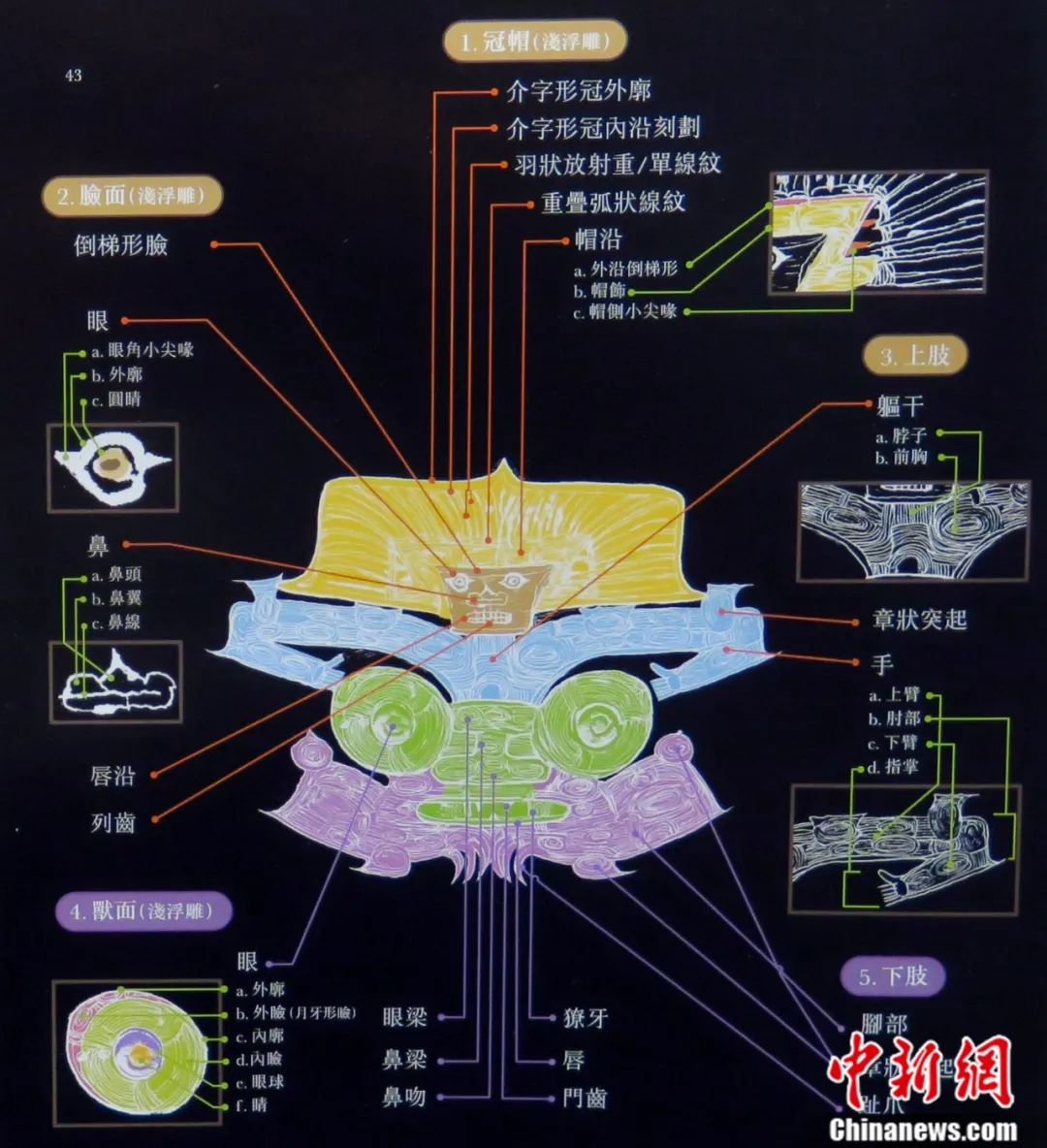 這個圖案的主體為“神人”,面部呈倒梯形,眼睛、鼻子、牙齒都非常寫實?!吧袢恕鳖^上還戴有高聳的羽冠,內(nèi)層刻有連續(xù)卷云紋的帽飾,外層為放射狀羽翎大冠?!吧袢恕钡乃闹家躁幖y細(xì)刻而成,上肢作抬臂、彎肘狀,五指平張。“神人”的身下是一只伏在地上的神獸(形似老虎),外框有橢圓形的眼瞼,之間以橋形凸面相連,有鼻梁和鼻翼,闊嘴內(nèi)有尖利的牙齒。