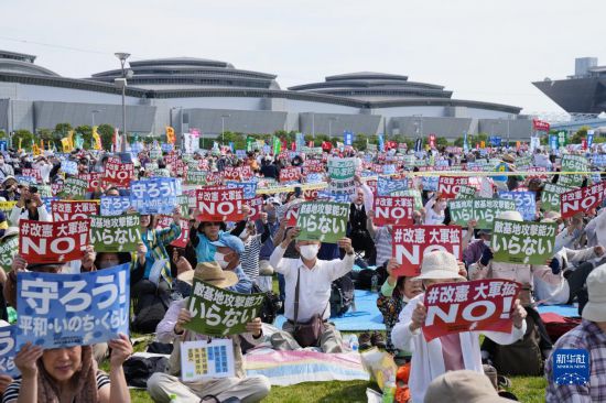 5月3日是日本憲法紀(jì)念日。當(dāng)天,約2.5萬名日本民眾聚集在東京有明防災(zāi)公園的廣場上,舉行了守護(hù)憲法集會(huì),他們打出守護(hù)憲法、反對(duì)強(qiáng)軍擴(kuò)武、不要反擊能力、反對(duì)修改憲法等內(nèi)容的標(biāo)語和旗幟,呼吁守護(hù)憲法、守護(hù)和平。