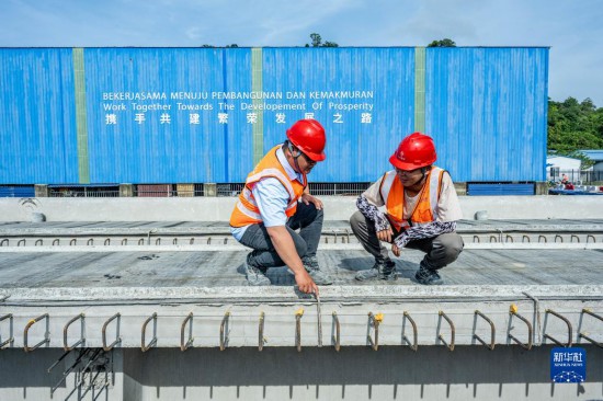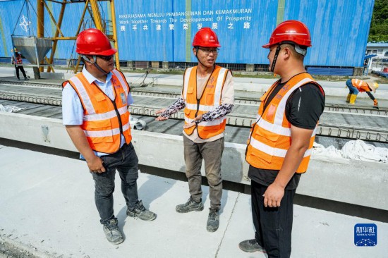 4月26日,在馬來西亞吉蘭丹州的馬東鐵項(xiàng)目一分部制梁場,技術(shù)主管鄧友志(右)和馬來西亞本地青年員工鄧德緯討論生產(chǎn)情況。五月初的馬來西亞烈日炎炎,中馬共建“一帶一路”的標(biāo)志性項(xiàng)目——馬來西亞東海岸鐵路(馬東鐵)建設(shè)如火如荼。十支由中馬兩國員工組成的青年突擊隊(duì)活躍在全長600多公里的馬東鐵沿線建設(shè)現(xiàn)場,用汗水和擔(dān)當(dāng)抒寫屬于這個時(shí)代的青春篇章。新華社記者 朱煒 攝