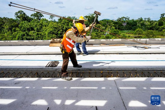 4月26日,工人在馬來西亞吉蘭丹州的馬東鐵項(xiàng)目一分部5號橋建設(shè)現(xiàn)場工作。新華社記者 朱煒 攝