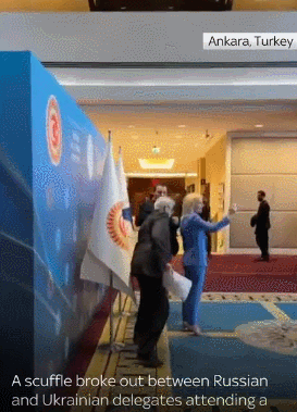 中新網(wǎng)5月5月電 綜合外媒報道,當(dāng)?shù)貢r間4日,在土耳其安卡拉舉行的黑海經(jīng)濟合作組織議會大會(PABSEC)會議間隙,俄烏代表團成員因為一面烏克蘭國旗扭打在了一起。