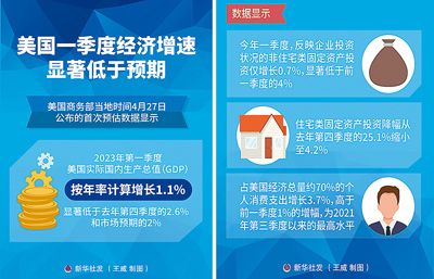 近日,美國商務(wù)部經(jīng)濟(jì)分析局?jǐn)?shù)據(jù)顯示,美國2023年一季度GDP年化環(huán)比增長1.1%,大幅低于市場(chǎng)預(yù)期的2%,較去年四季度2.6%的增幅有所回落,已連續(xù)兩個(gè)季度放緩。《華爾街日?qǐng)?bào)》網(wǎng)站報(bào)道稱,在通貨膨脹仍然高企、利率不斷上升的情況下,美國第一季度經(jīng)濟(jì)增長下滑,增加了人們對(duì)今年晚些時(shí)候可能出現(xiàn)經(jīng)濟(jì)衰退的擔(dān)憂。