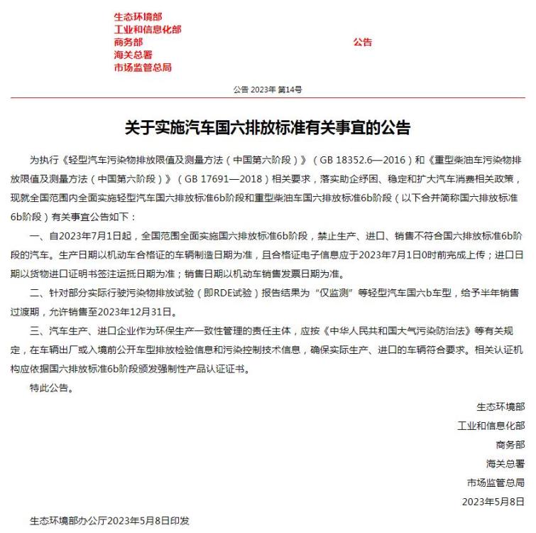 其中要求,自2023年7月1日起,全國范圍全面實施國六排放標準6b階段,禁止生產(chǎn)、進口、銷售不符合國六排放標準6b階段的汽車。生產(chǎn)日期以機動車合格證的車輛制造日期為準,且合格證電子信息應于2023年7月1日0時前完成上傳;進口日期以貨物進口證明書簽注運抵日期為準;銷售日期以機動車銷售發(fā)票日期為準。