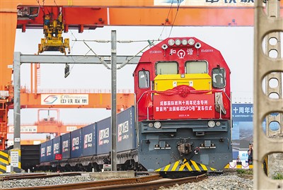 中歐班列是中法進(jìn)出口貿(mào)易的重要橋梁。圖為4月26日,為紀(jì)念成都國(guó)際班列十周年而開行的“法國(guó)郵政DPD專列”在四川省成都市青白江區(qū)國(guó)際鐵路港首發(fā)。