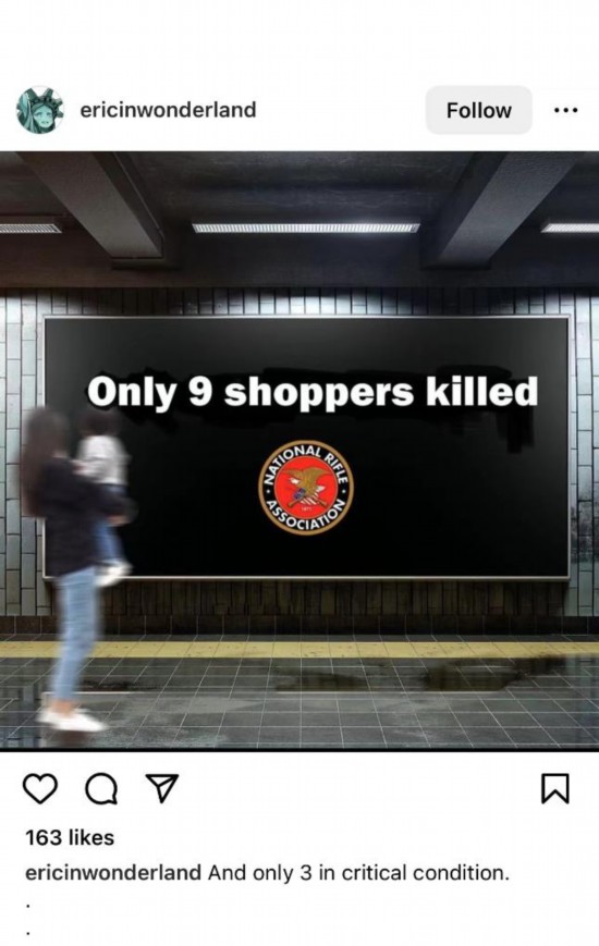 網(wǎng)友Ericinwonderland創(chuàng)作了一則帶有美國(guó)步槍協(xié)會(huì)標(biāo)識(shí)的“廣告”,上面寫(xiě)道:“只死了9個(gè)?!?/p>