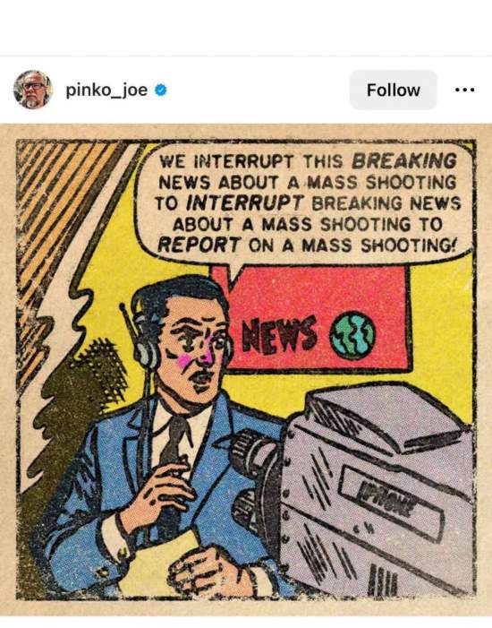 網(wǎng)友Pinko_joe的漫畫(huà)主角是一名記者,他對(duì)著鏡頭說(shuō):“下面讓我們打斷一下關(guān)于大規(guī)模槍擊的突發(fā)報(bào)道,臨時(shí)插播另一條關(guān)于大規(guī)模槍擊的突發(fā)新聞!”