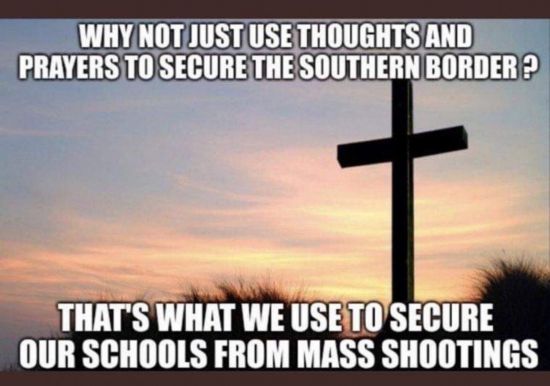 這幅漫畫(huà)則諷刺說(shuō):“為什么我們不只靠祈禱來(lái)阻止非法移民進(jìn)入美國(guó)?我們可是只靠祈禱來(lái)保護(hù)學(xué)校不發(fā)生大規(guī)模槍擊?!?/p>