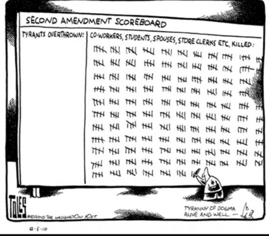 這幅漫畫(huà)題為《第二修正案“得分板”》,右邊顯示因?yàn)榈诙拚杆劳龅耐?、學(xué)生、配偶、商店售貨員等各色人等。美國(guó)憲法第二修正案是美國(guó)公民擁槍的主要法律依據(jù)。