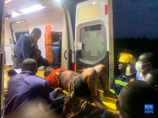 5月30日,救援人員在加納中部省大客車與油罐車相撞事故現(xiàn)場(chǎng)搶救傷者。新華社發(fā)