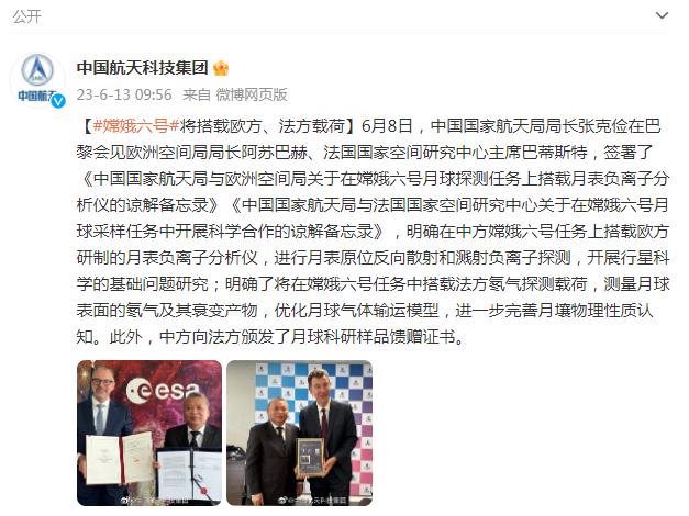 中新網6月13日電 據中國航天科技集團有限公司官方微博消息,6月8日,中國國家航天局局長張克儉在巴黎會見歐洲空間局局長阿蘇巴赫、法國國家空間研究中心主席巴蒂斯特,簽署了《中國國家航天局與歐洲空間局關于在嫦娥六號月球探測任務上搭載月表負離子分析儀的諒解備忘錄》《中國國家航天局與法國國家空間研究中心關于在嫦娥六號月球采樣任務中開展科學合作的諒解備忘錄》,明確在中方嫦娥六號任務上搭載歐方研制的月表負離子分析儀,進行月表原位反向散射和濺射負離子探測,開展行星科學的基礎問題研究;明確了將在嫦娥六號任務中搭載法方氡氣探測載荷,測量月球表面的氡氣及其衰變產物,優(yōu)化月球氣體輸運模型,進一步完善月壤物理性質認知。此外,中方向法方頒發(fā)了月球科研樣品饋贈證書。